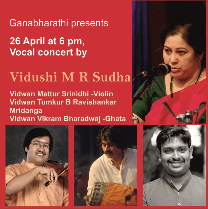 ಗಾನಭಾರತಿಯಲ್ಲಿ ಏಪ್ರಿಲ್ 26ರಂದು ಸಂಜೆ 6 ಗಂಟೆಗೆ ಎಂ ಆರ್ ಸುಧಾ ಅವರಿಂದ ಗಾಯನ ಕಾರ್ಯಕ್ರಮವನ್ನು ಏರ್ಪಡಿಸಲಾಗಿದೆ. ಅವರಿಗೆ ವಿದ್ವಾನ್ ಮತ್ತೂರು ಶ್ರೀನಿಧಿ ಅವರು ವಯೋಲಿನಿನಲ್ಲಿ, ವಿದ್ವಾನ್‍ ತುಮಕೂರು ಬಿ.ರವಿಶಂಕರ್‍ ಅವರು ಮೃದಂಗದಲ್ಲಿ ಹಾಗೂ ವಿದ್ವಾನ್ ವಿಕ್ರಂ ಭಾರದ್ವಾಜ್‍ ಅವರು ಘಟದಲ್ಲಿ ಸಹಕರಿಸಲಿದ್ದಾರೆ.