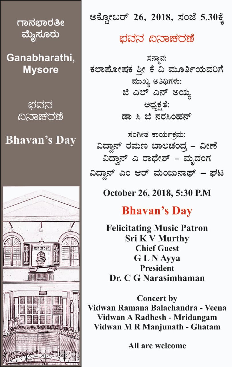 Ganabharathi is celebrating 28th Bhavan’s Day on 26th oct 2018 at Veenesheshanna Bhavana at 5.30pm. On this occasion ganabharathi takes pleasure in felicitating the Art patron Sri K V Murthy and a Veena concert by Vid Ramana Balachandra accompanied by Vid A Radhesh on Mridanga and Vid M R Manjunatha on ghata is also organized on the same same day.