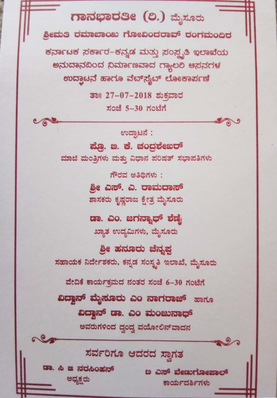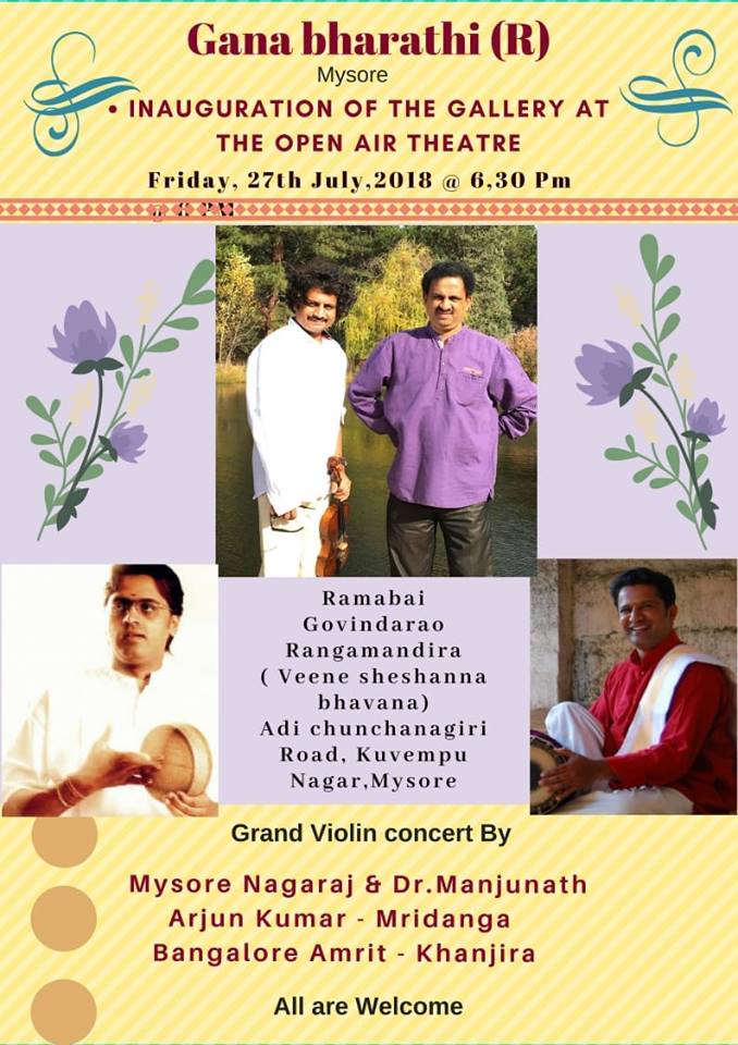 Gana Bharathi presents voilin duet by legends Mysore Nagaraj Dr Mysore Manjunath , accompanied by Arjun Kumar on Mridanga and Bangalore Amrit on Ghata. On 27th July at Ganabharati Open Air Theatre. All are welcome.