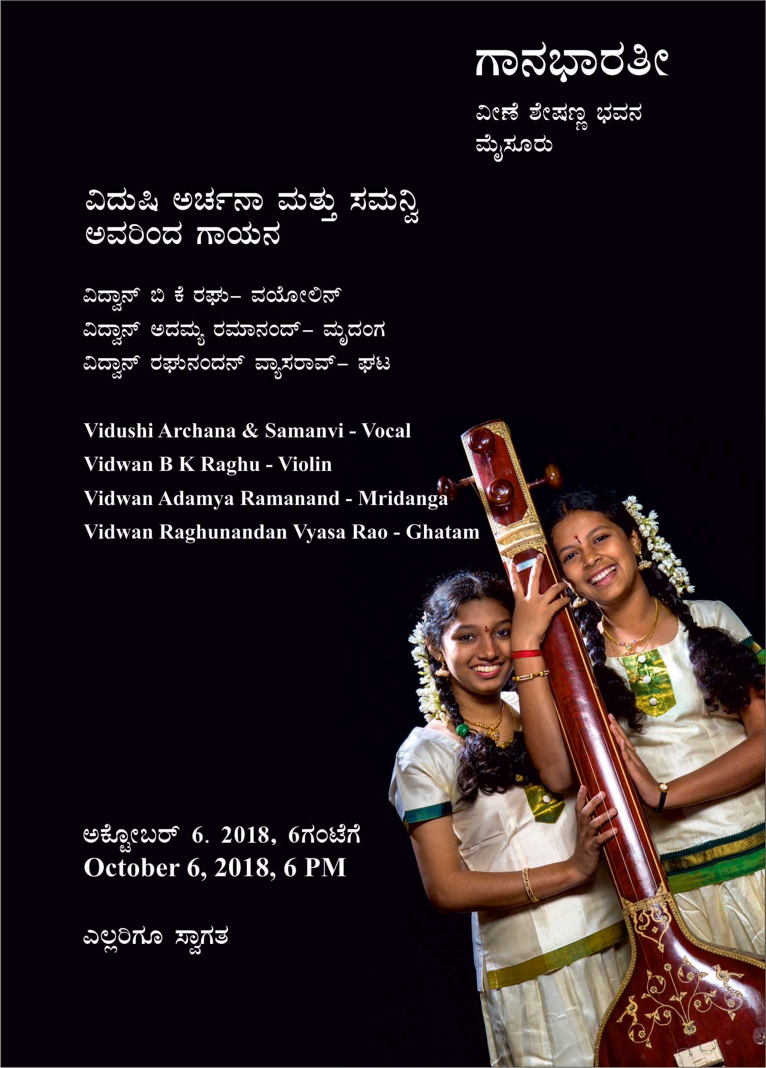 ಗಾನಭಾರತೀಯಲ್ಲಿ ಅಕ್ಟೋಬರ್ 6. 2018, 6ಗಂಟೆಗೆ ಯುವ ಪ್ರತಿಭಾವಂತ ಕಲಾವಿದರಾದ ವಿದುಷಿ ಅರ್ಚನಾ ಹಾಗೂ ಸಮನ್ವಿ ಅವರ ಕರ್ನಾಟಕ ಶಾಸ್ತ್ರೀಯ ಸಂಗೀತ ಕಾರ್ಯಕ್ರಮವನ್ನು ಹಮ್ಮಿಕೊಳ್ಳಲಾಗಿದೆ. ಇವರಿಗೆ ವಯೋಲಿನಿನಲ್ಲಿ ವಿದ್ವಾನ್ ಬಿ ಕೆ ರಘು, ಮೃದಂಗದಲ್ಲಿ ವಿದ್ವಾನ್ ಅದಮ್ಯ ರಮಾನಂದ್ ಹಾಗೂ ಘಟದಲ್ಲಿ ವಿದ್ವಾನ್ ರಘುನಂದನ್ ವ್ಯಾಸರಾವ್ ಅವರು ಸಹಕರಿಸಲಿದ್ದಾರೆ.
